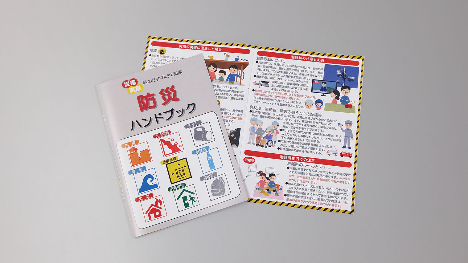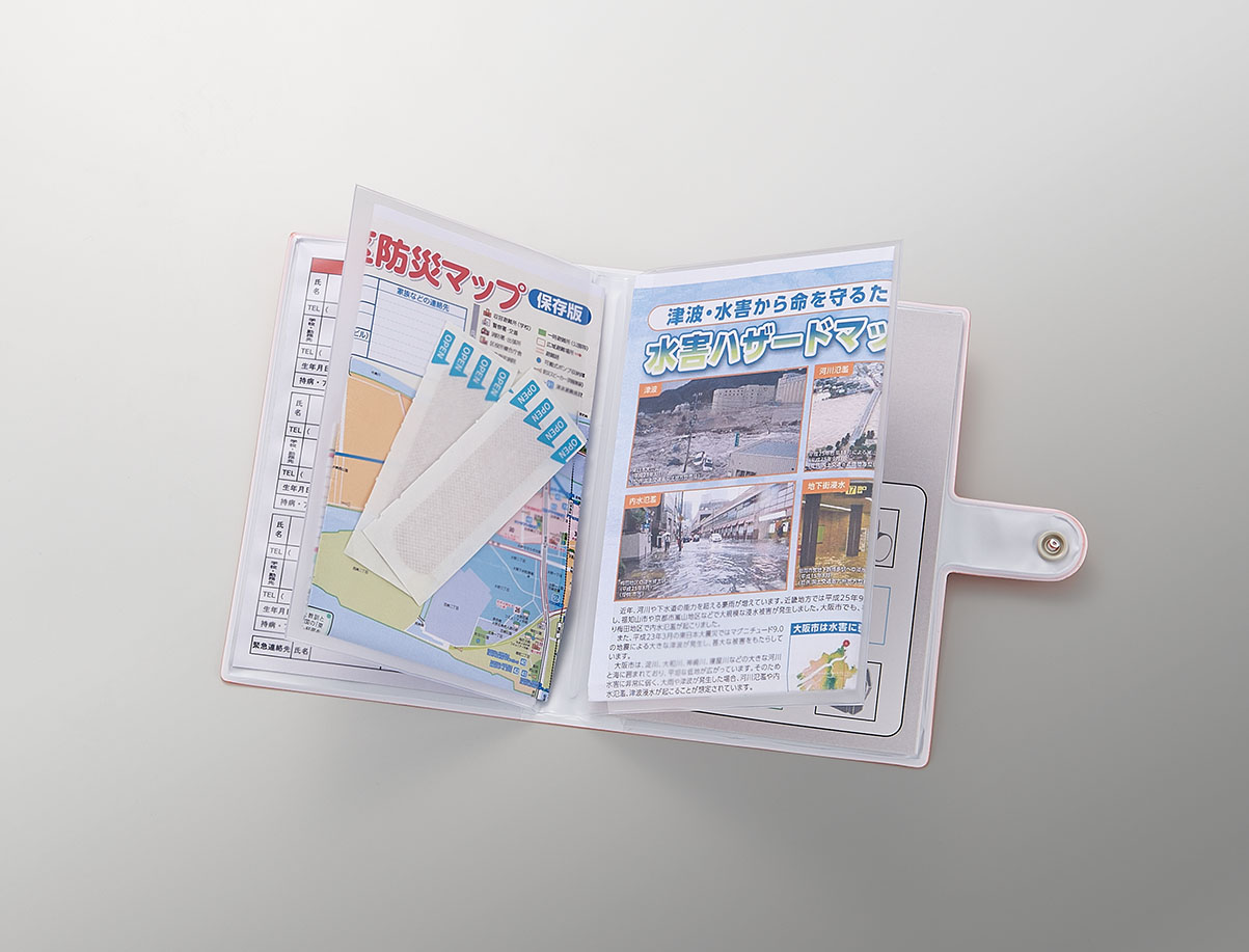 防災緊急時の心得ハンドブック、IDカードが付いた防災手帳です。フリーポケットが2個付で、各自で必要な資料などを収納しておくのに便利!