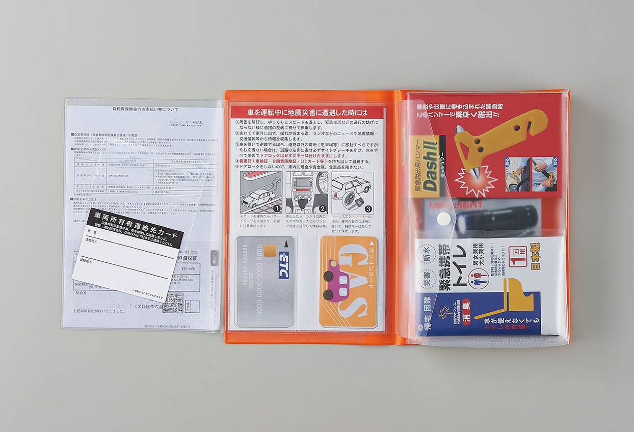 お車運転時に地震発生で車を置いて避難する際、貴重品(車検証・自賠責保険・ETCカード等)を収納出来るポケット付ケースと最低限必要な避難用品をキットにしました。ダッシュボード収納可能サイズ!