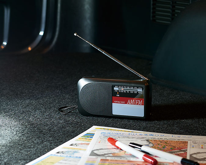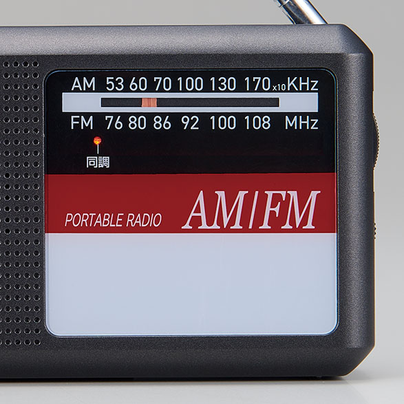 非常時で慌てる時こそ年齢問わず使用できるシンプルで使いやすい電池式AM/FMラジオ。同調ランプ付きで簡単チューニング。