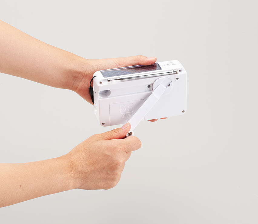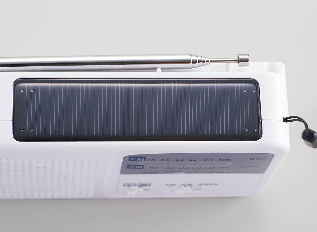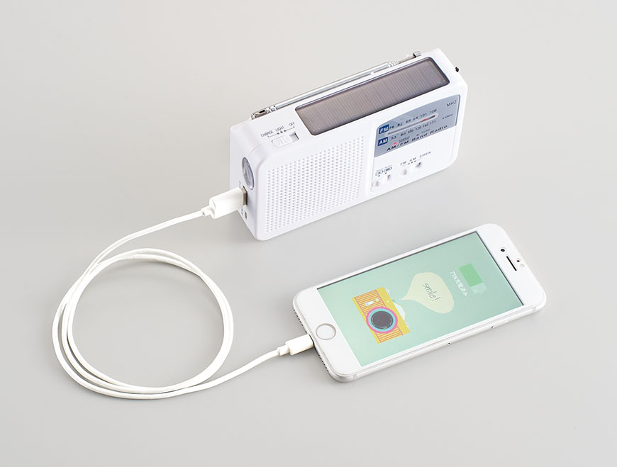 スマートフォンの充電も可能。携帯電話充電、AM/FMラジオ、サイレン、ライトの4機能!ダイナモ、ソーラー、電池も使用でき便利。