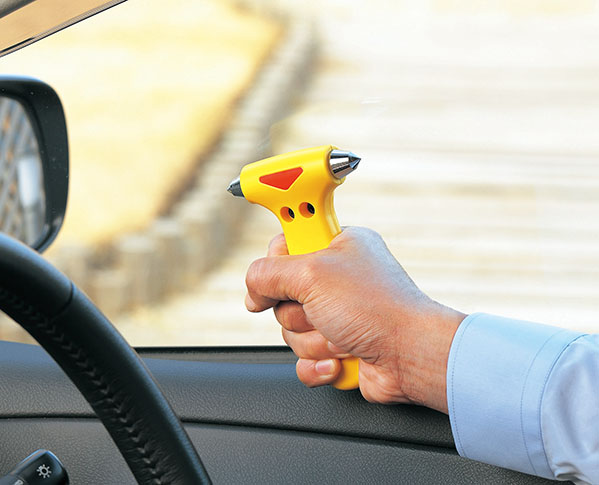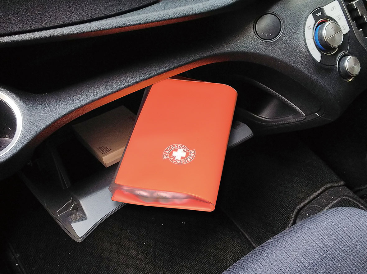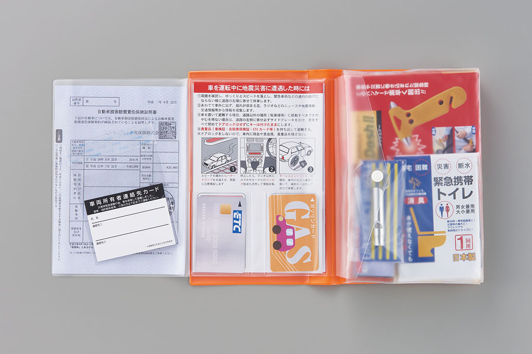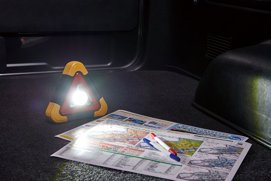 ダッシュボード収納可能サイズのケースに最低限必要な避難用品をまとめたキットと緊急表示灯として安全を守る三角停止板型ライトのセット。