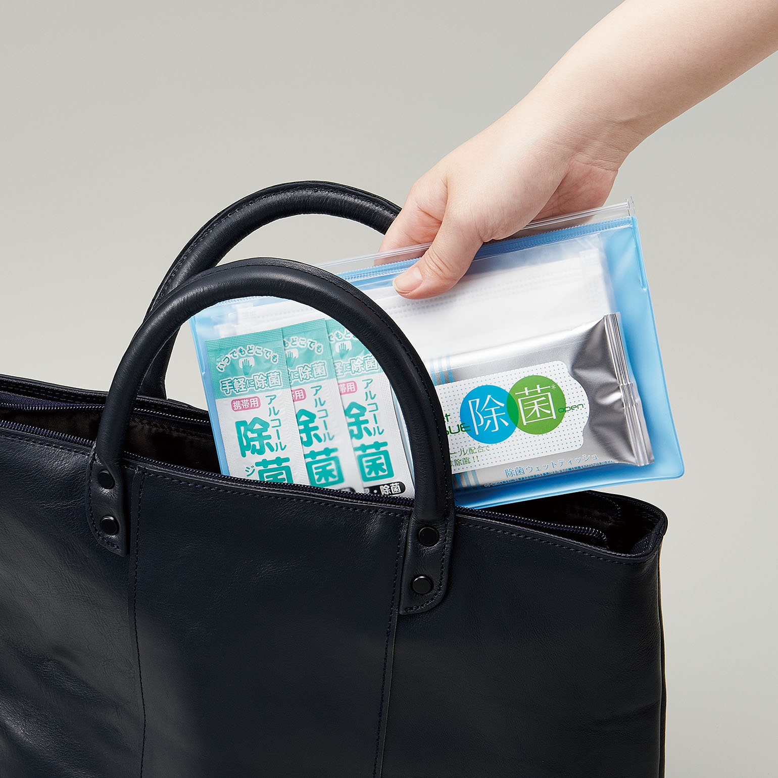 スライダーケースに感染症予防アイテムをセットした携帯用ウイルス対策セット。ケース背面にはマスクポケット付きで、一時的に外したマスクを保管出来ます。