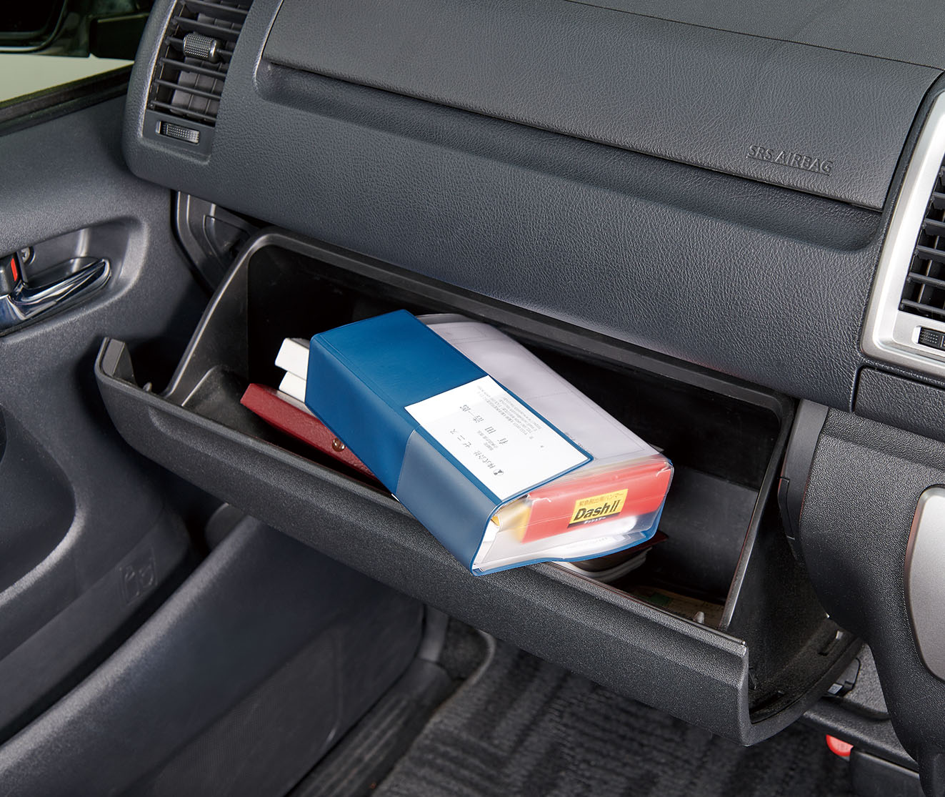 電子車検証に対応した車検証ケースに避難グッズをセットしました。ダッシュボード収納可能サイズ!